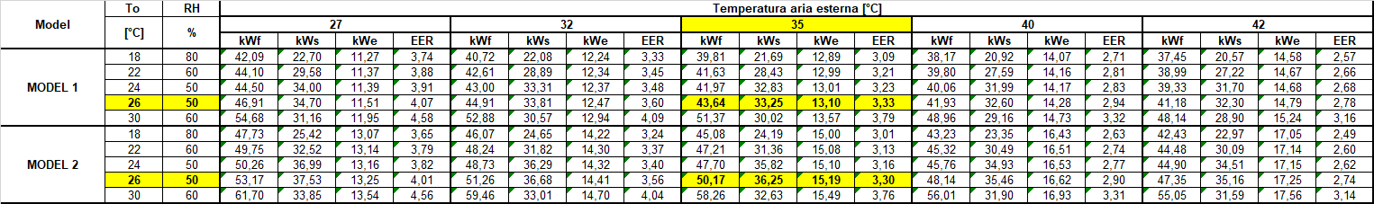 - compressor capacity, total capacity, absorbed power, fans absorbed power, total absorbed power, compressors EER, fans EER and total EER.