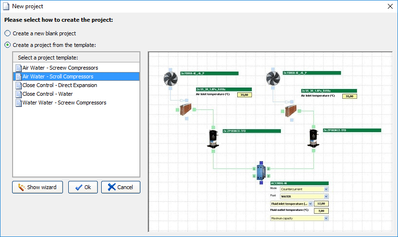 Or create an empty project, dragging and dropping the components. It all happens in a graphical environment where the designer can draw the layout of the unit by dropping the required components of the new unit, such as evaporators and condensers (air, plate or shell & tube), compressors and fans (axial and centrifugal, even EC fans), with just a click.