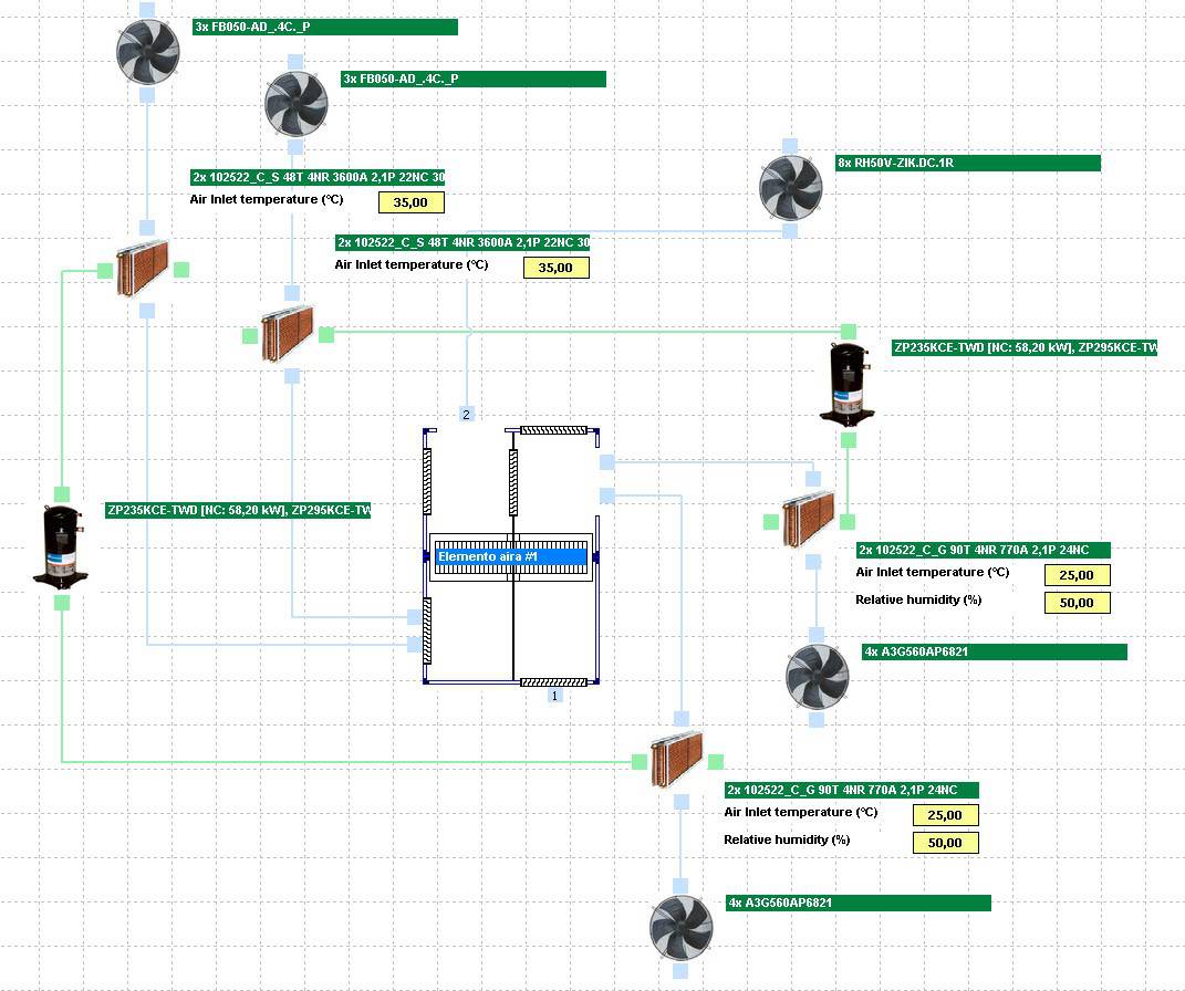 - compressor capacity, total capacity, absorbed power, fans absorbed power, total absorbed power, compressors EER, fans EER and total EER.