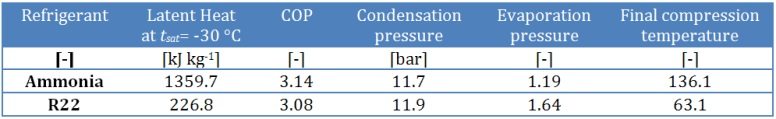 The thermodynamic benefits and drawbacks of ammonia can be summarized in the next table, which lists the most important characteristics of an ideal refrigerating cycle +30°C/-30°C with isobaric condensation and evaporation processes and isentropic compression. The reference fluid for the comparisons is R22 because it is the traditional synthetic refrigerant, which presents similar values of saturation temperature-pressure curve. Furthmore, R22 can be considered as a benchmark for efficiency aspects. From the analysis of p-h diagram and of the values reported in the table, we can state that this fluid presents an extraordinary large latent heat of vaporization, which implies that the total mass flow rate a given cooling capacity is lower than that required by traditional refrigerants (around 15% lower than that for R22).
