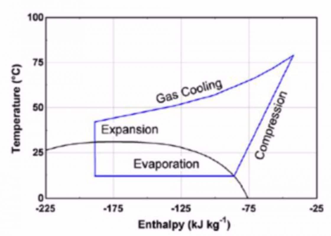 The condenser has to be substituted by a gas-cooler, where the carbon dioxide will be cooled without any phase change process. Figure 1 reports a typical transcritical cycle on a T-h plot.