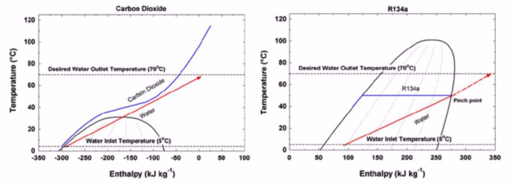 Figure 2 shows water being heated by CO2 and R134a. A pinch effect is observed in the R134a case, when a water outlet temperature of 70 °C is desired. Increasing the high-side pressure of the R134a system would allow higher water delivery temperatures; however, the corresponding narrowing of the vapor dome and increased pressure ratio would be detrimental to system performance. The temperature profile of the CO2, on the other hand, matches well with the high temperature lift required by the water. This evidence highlights, one more time, the interesting characteristics of the transcritical cycle for water heating applications.