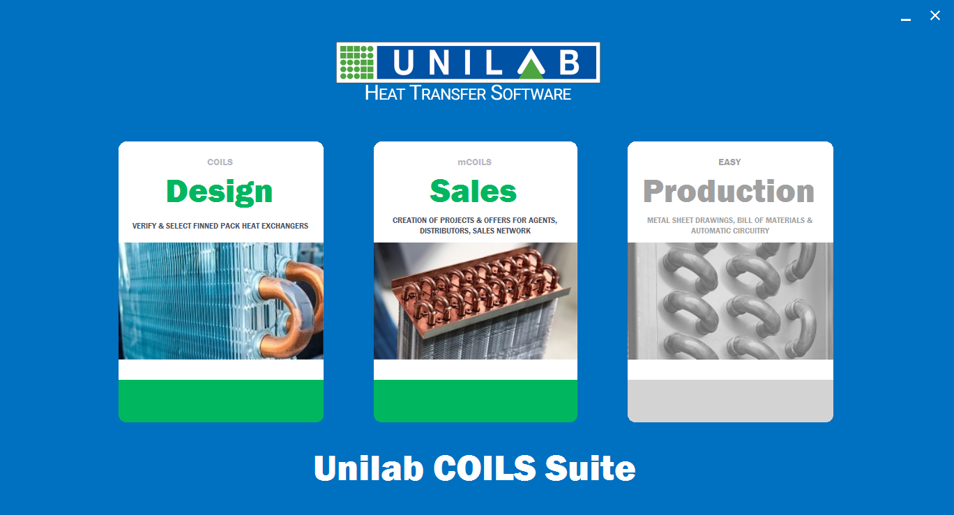 COILS SUITE è la soluzione software Unilab specificatamente studiata per aumentare velocità e precisione in tutte le fasi del processo di proposizione, vendita e produzione degli scambiatori alettati.