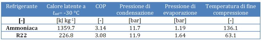 Si è scelto come fluido di riferimento l’R22, il refrigerante sintetico tradizionale che presenta una curva pressione-temperatura di saturazione molto simile a quella dell’ammoniaca. Inoltre, l’R22 può essere considerato un riferimento nei riguardi dell’efficienza energetica. Dall’analisi del diagramma p-h e dei valori riportati in tabella, possiamo affermare che l’ammoniaca presenta un incredibilmente elevato calore latente di vaporizzazione che implica che la portata di massa necessaria per garantire una determinata potenza frigorifera sia minore rispetto a quella che è necessaria con un refrigerante tradizionale (circa il 15% in meno rispetto all’ R22).