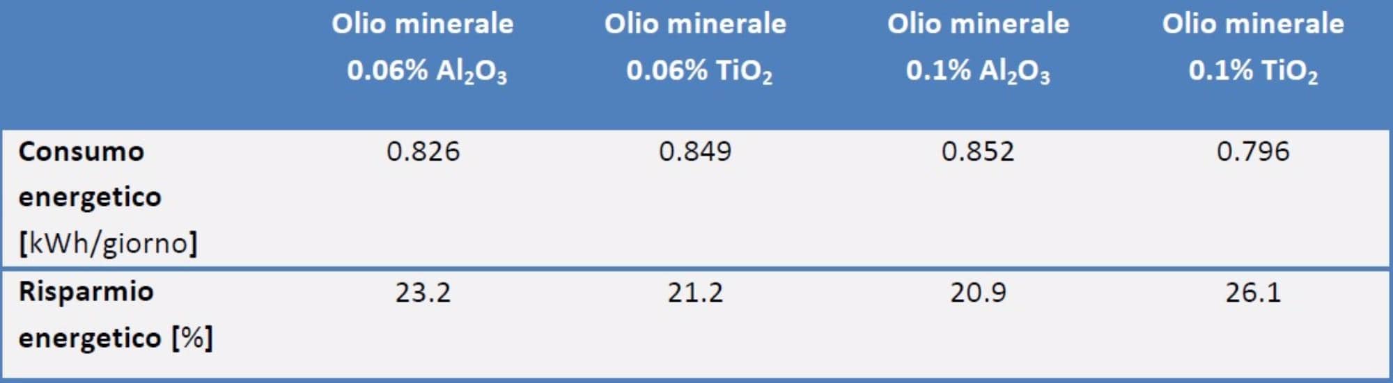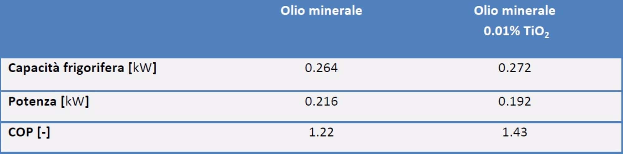 Una frazione volumetrica pari allo 0.01% di TiO2 fu aggiunta all’olio minerale per ottenere il nuovo lubrificante; la seguente Tabella riporta i risultati sperimentali misurati durante il funzionamento di una piccola unità refrigerata.