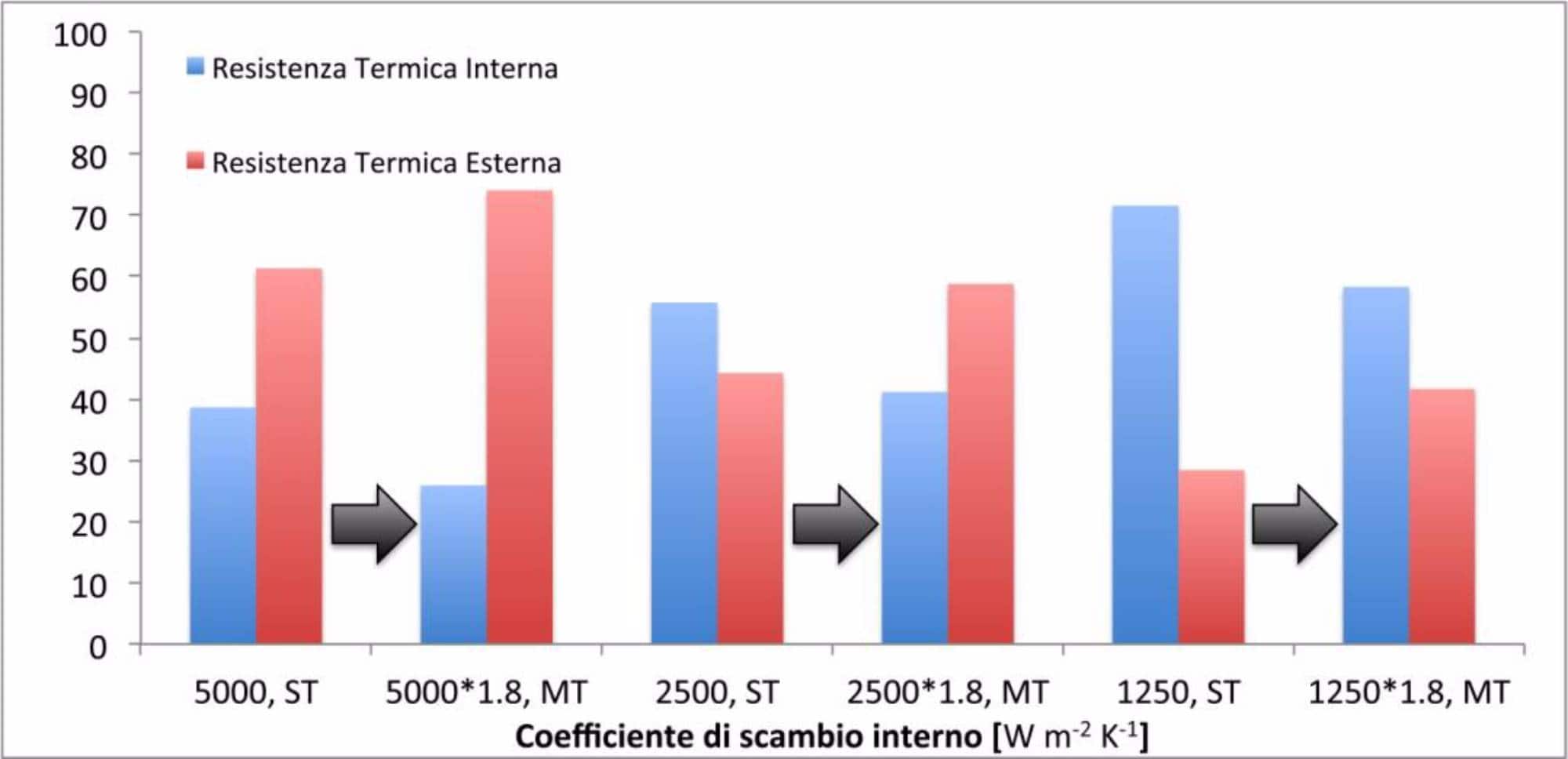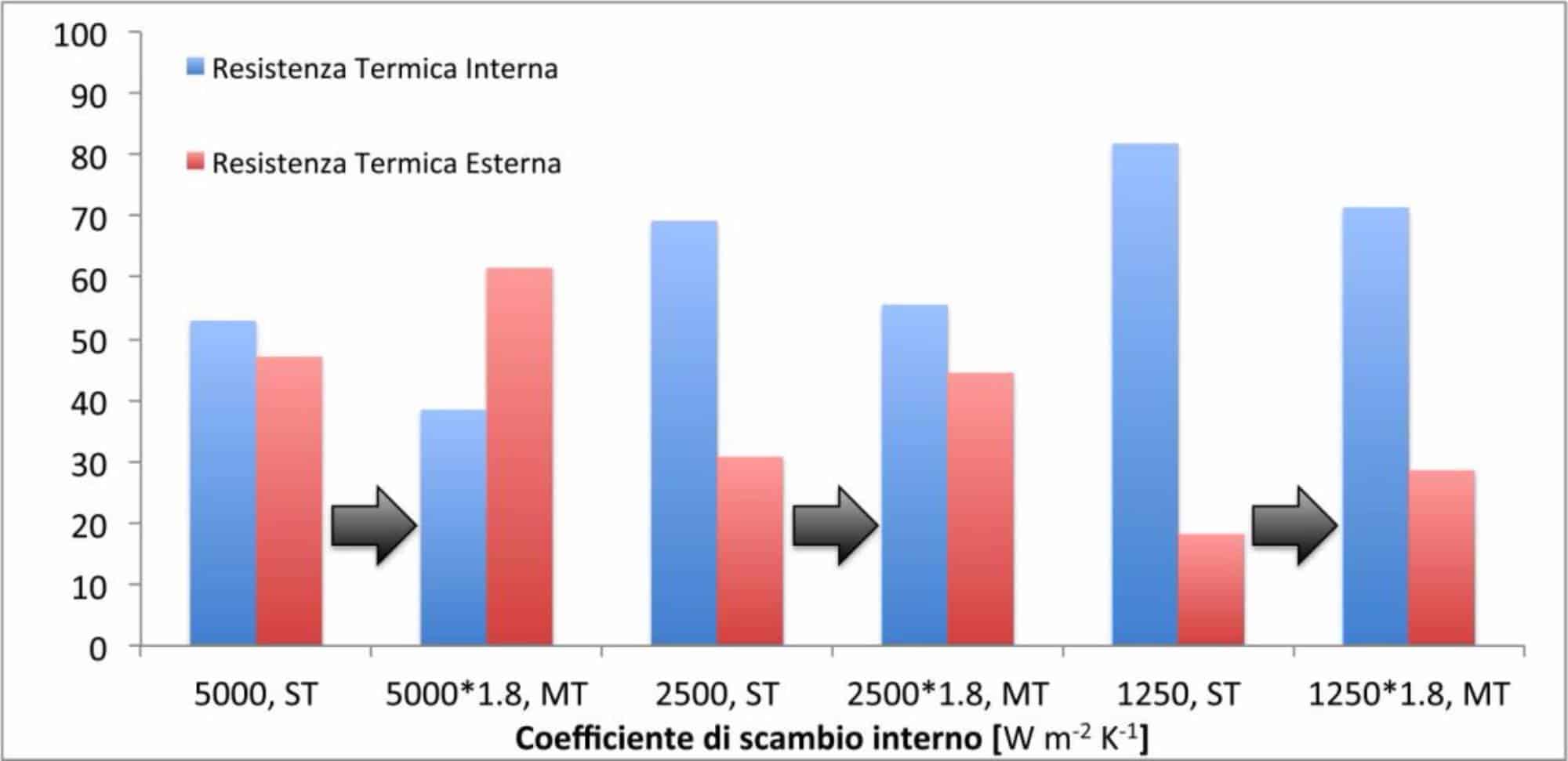 Considerando il tubo liscio, quando = 5000 W m-2 K-1 (5000, ST), la resistenza termica lato aria è dominante: quindi l’uso del tubo microalettato non è giustificato come evidenziato dal caso 5000*1.8, MT. Quando diminuisce, la resistenza termica lato tubo aumenta rapidamente facendo sì che l’utilizzo del tubo microfin sia necessario, come dimostrato dai casi 1250, ST e 1250*1.8, MT: l’uso del tubo microfin permette di armonizzare le resistenze termiche portando all’ottimizzazione dello scambiatore di calore.